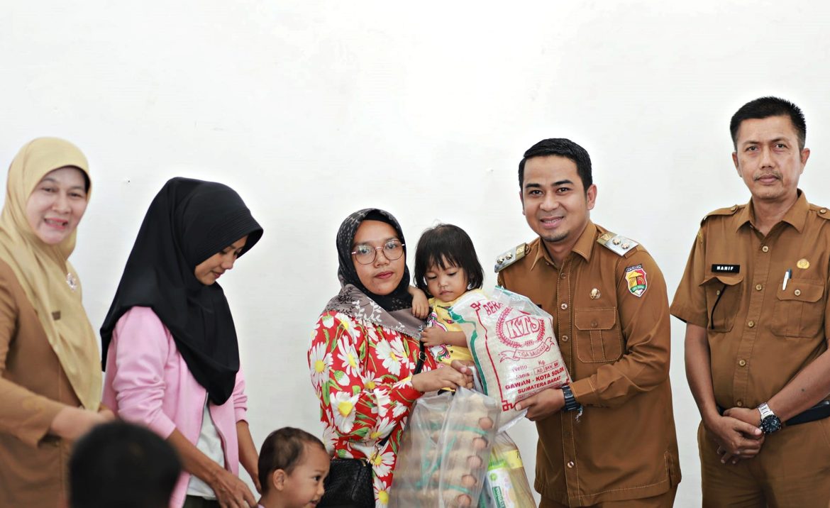 Ada 100 kepala keluarga yang memiliki balita stunting menerima bantuan pangan. Paket bantuan tersebut meliputi 15 kg beras premium, 2 botol minyak goreng, 1 kg kacang hijau, 2 kg telur ayam, 3 bungkus biskuit promina, dan 1 kaleng sarden. (van)