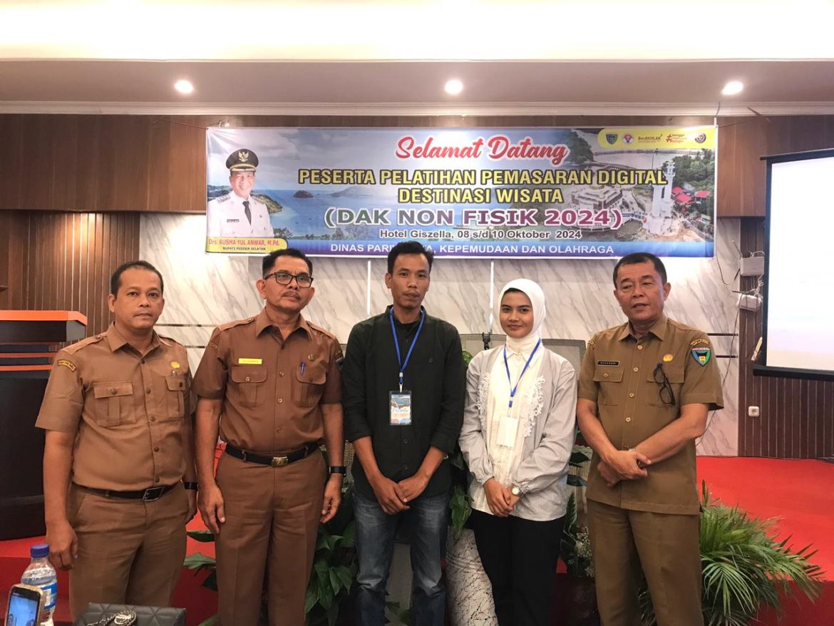 PESISIR SELATAN, KP – Dinas Pariwisata Pemuda dan Olahraga Kabupaten Pesisir Selatan menggelar Pelatihan Pemasaran Digital Destinasi Wisata selama tiga hari, mulai Selasa (8/10) di Hotel Gizela. Kegiatan ini diikuti kelompok sadar wisata (pokdarwis), fotografer, dan pengelola objek wisata, menggunakan alokasi DAK Non-Fisik 2024.