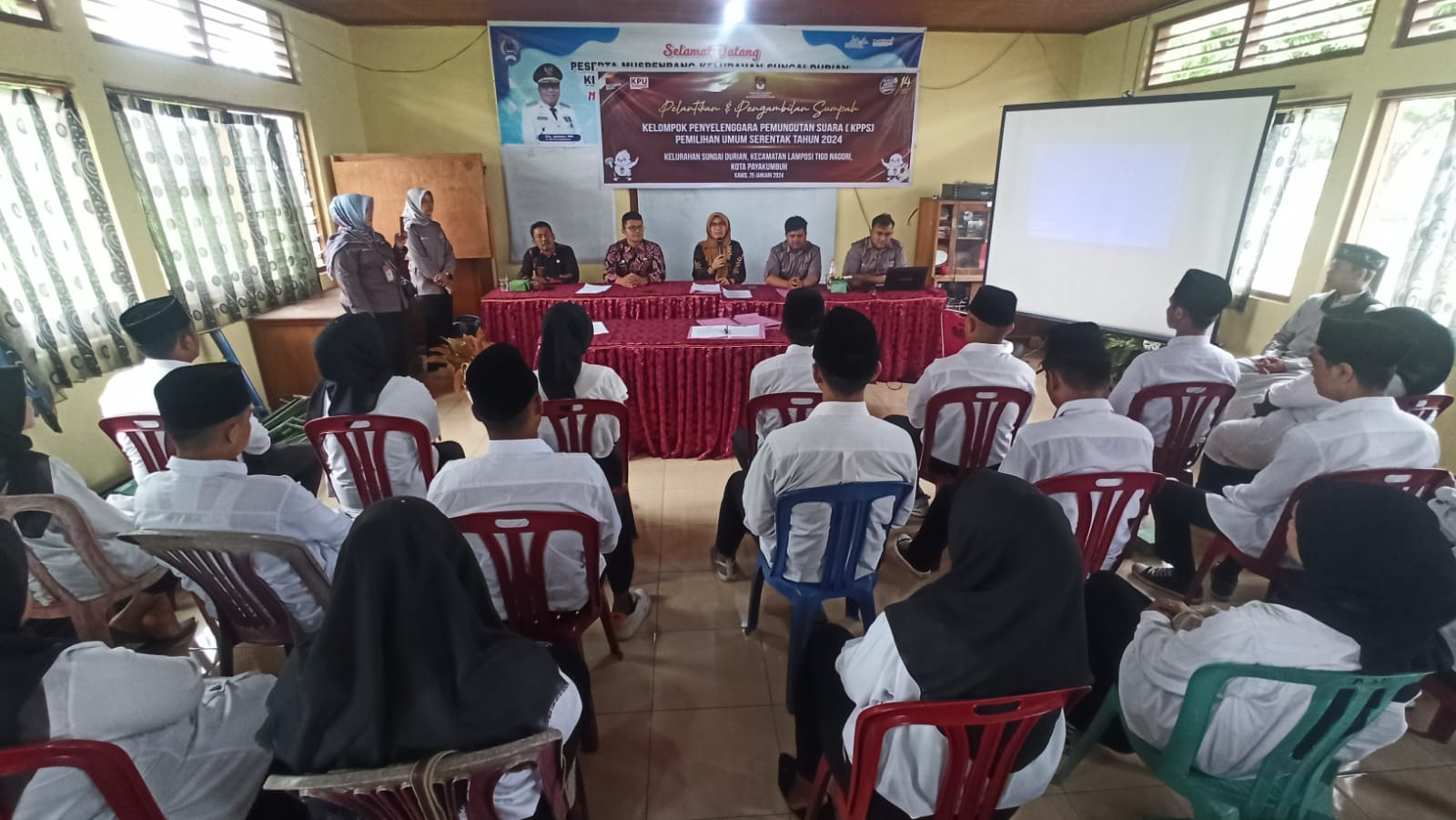 PAYAKUMBUH, KP – Puluhan anggota Kelompok Penyelenggara Pemungutan Suara (KPPS) untuk Pemilu serentak tahun 2024 di Kelurahan Sungai Durian, Kecamatan Lamposi Tigo Nagari (Latina) Kota Payakumbuh, resmi dilantik dan diambil sumpah, Kamis (25/1). Pelantikan ini dilakukan serentak di seluruh Indonesia.