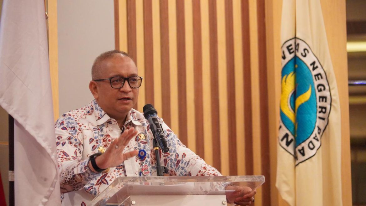 PADANG, KP –  Penjabat (Pj) Wali Kota Padang Andree Algamar memberikan kuliah umum tentang tantangan dan dinamika dalam penyelenggaraan pemerintah daerah di Kota Padang, di Auditorium Fakultas Ilmu Sosial (FIS) Universitas Negeri Padang (UNP), Kamis (28/11).