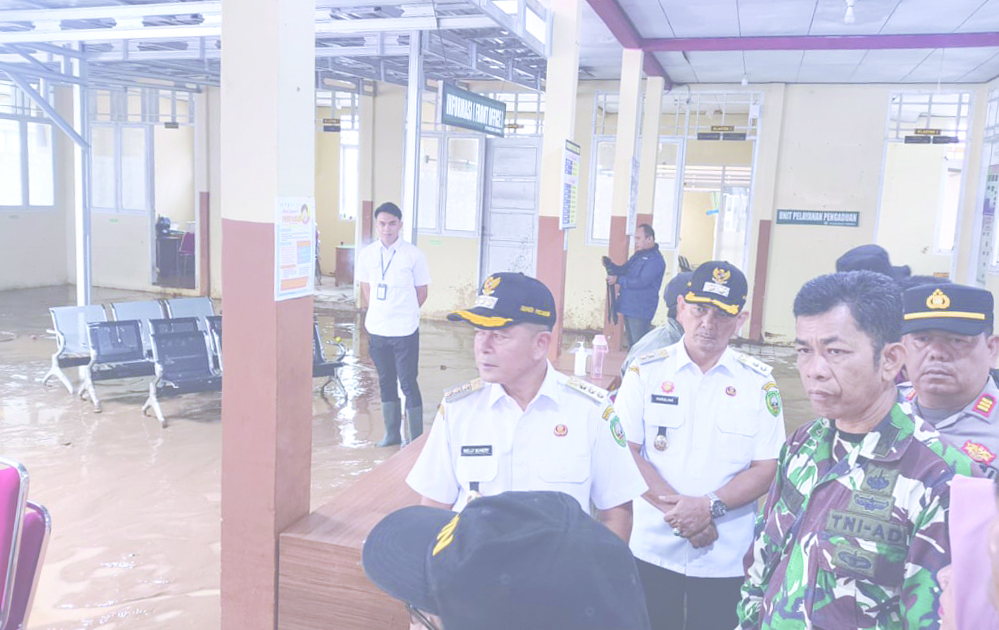 Bupati Pasaman Welly Suhery didampingi Wakil Bupati H. Parulian dan jajaran terkait meninjau kondisi Puskesmas Simpati yang terdampak banjir luapan, Rabu (15/4).