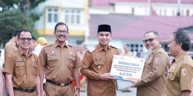 SOLOK, KP – Wakil Wali Kota Solok Ramadhani Kirana Putra didampingi Sekretaris Daerah (Sekda) Kota Solok Syaiful A dan Kepada Badan Kepegawaian dan Pengembangan Sumber Daya Manusia Bitel, menyerahkan Surat Keputusan (SK) Pensiun dan Tabungan Hari Tua kepada 6 ASN di lingkungan Pemko Solok yang memasuki masa pensiun per tanggal 1 Februari 2024, di halaman apel Balaikota Solok, Senin (29/1).