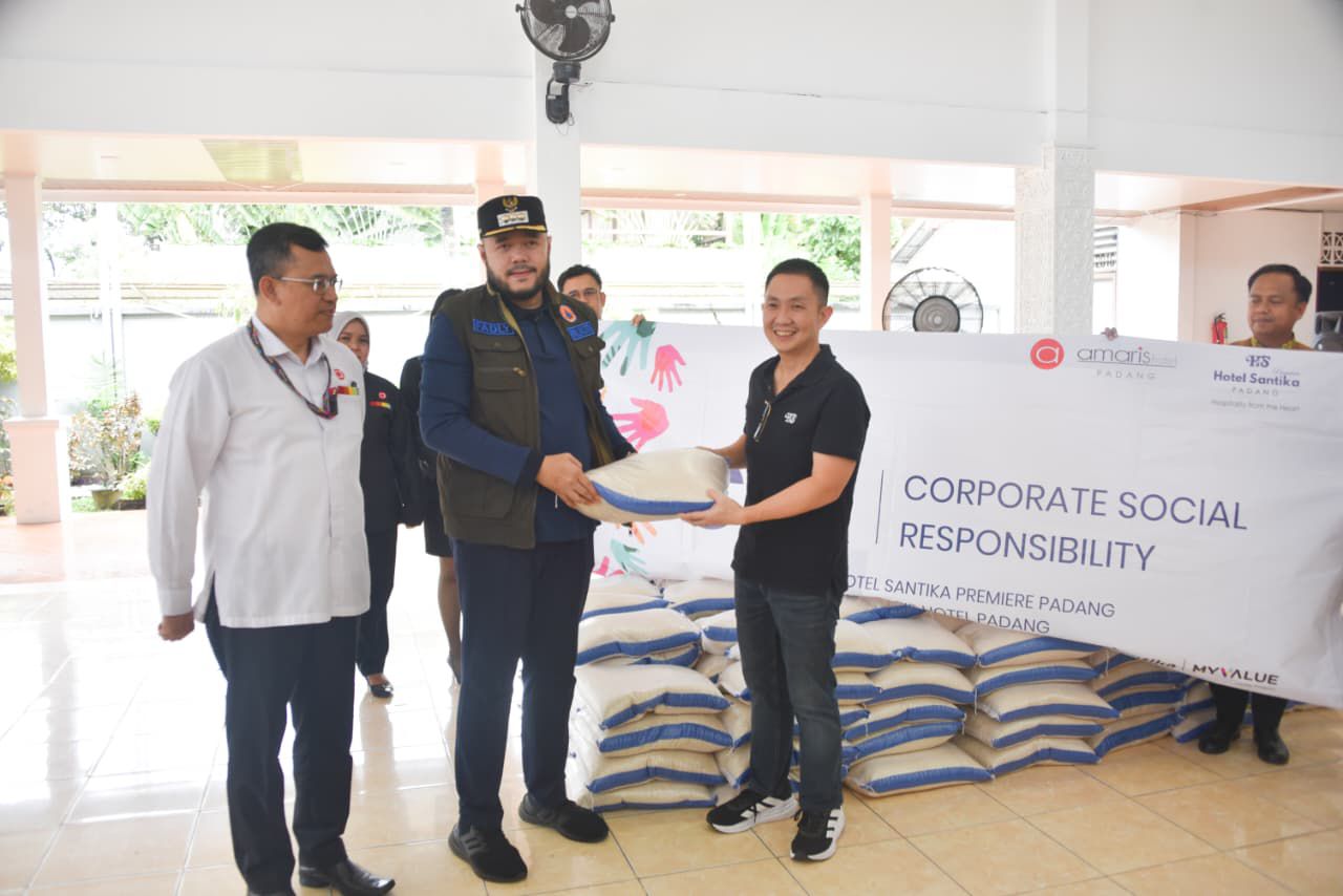 PADANG, KP — Bantuan bagi warga terdampak bencana hidrometeorologi di Kota Padang terus berdatangan sepanjang hampir satu minggu terakhir. Pada Jumat (28/11), Grup Santika dan Amaris Hotel menyalurkan dua ton beras untuk korban bencana.