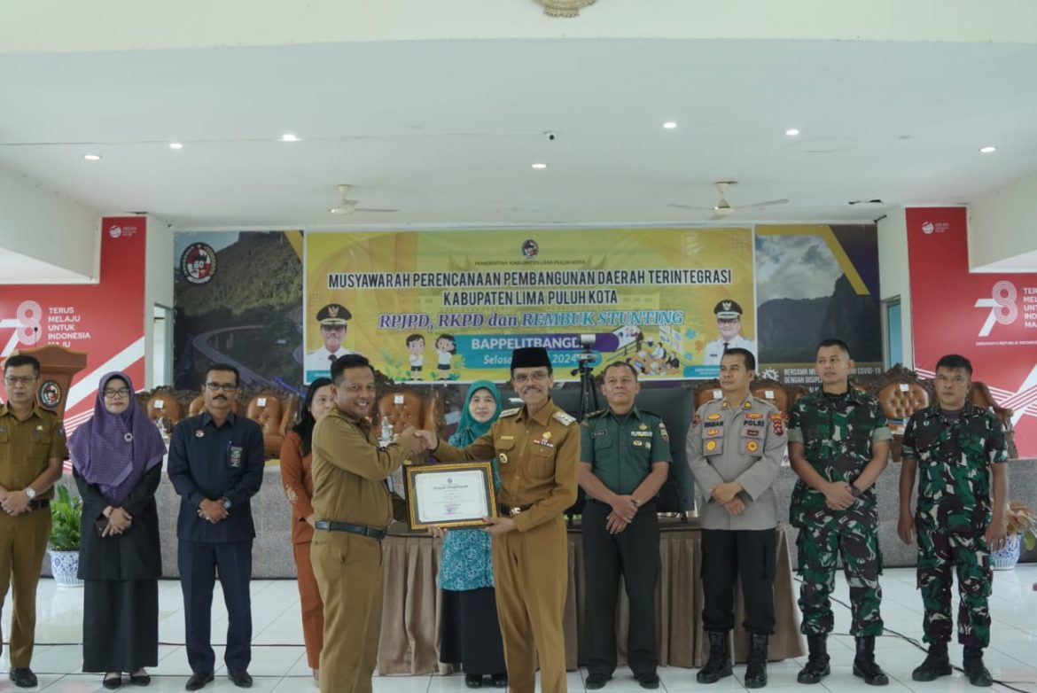 LIMA PULUH KOTA, KP – Rencana Pembangunan Jangka Panjang Daerah (RPJPD) Kabupaten Lima Puluh Kota 2025-2045 berfokus pada peningkatan kualitas Sumber Daya Manusia (SDM), perekonomian produktif, serta pembangunan yang ramah lingkungan berbasis ekonomi sirkular. Infrastruktur yang tangguh dan ketahanan terhadap bencana serta krisis iklim juga menjadi prioritas.
