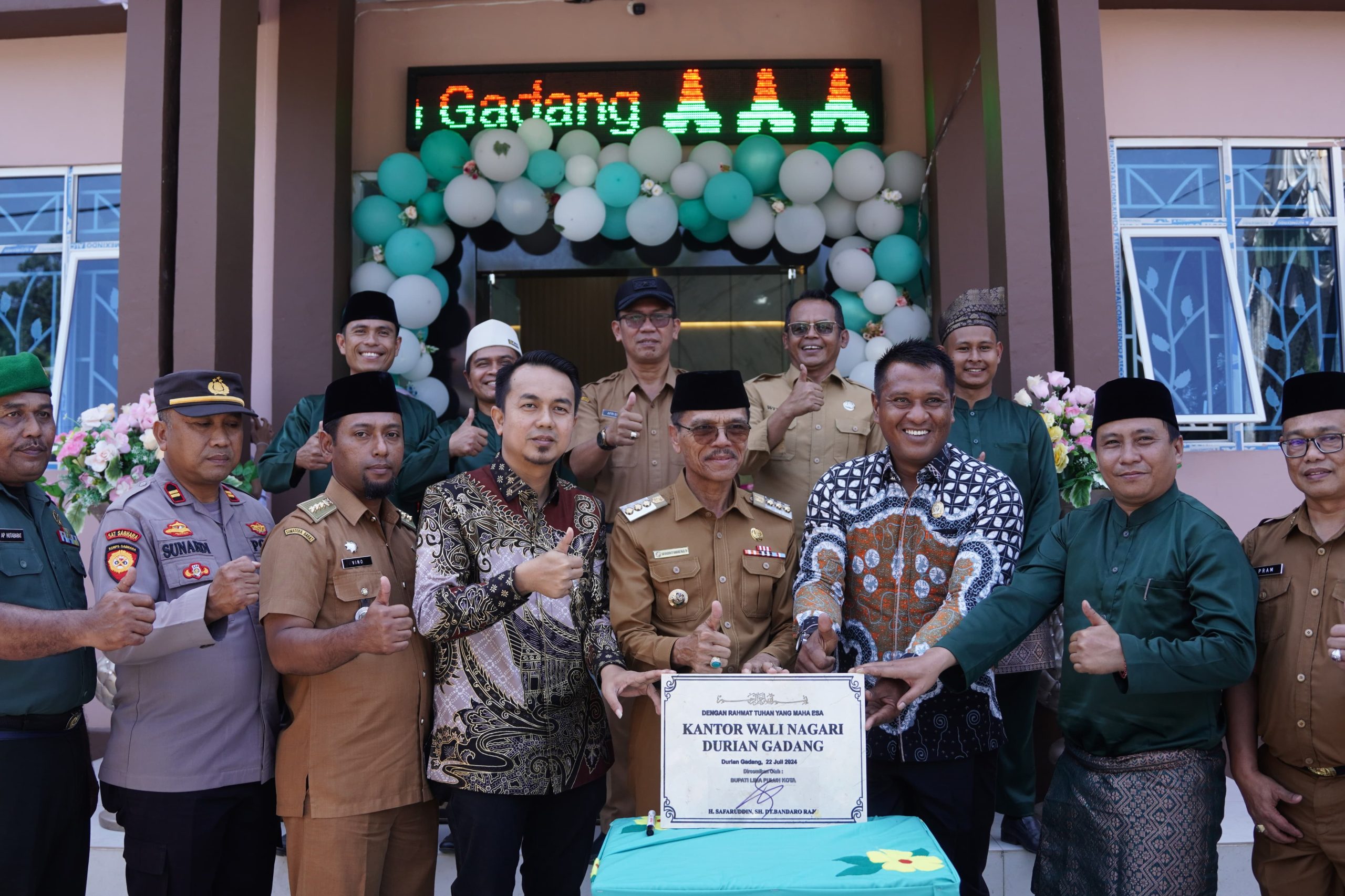 LIMAPULUH KOTA, KP – Bupati Limapuluh Kota Safaruddin, meresmikan Gedung Baru Kantor Wali Nagari Durian Gadang, di Kecamatan Akabiluru, Senin (22/7). Bupati Safaruddin berharap gedung baru itu dapat meningkatkan kualitas pelayanan kepada masyarakat.