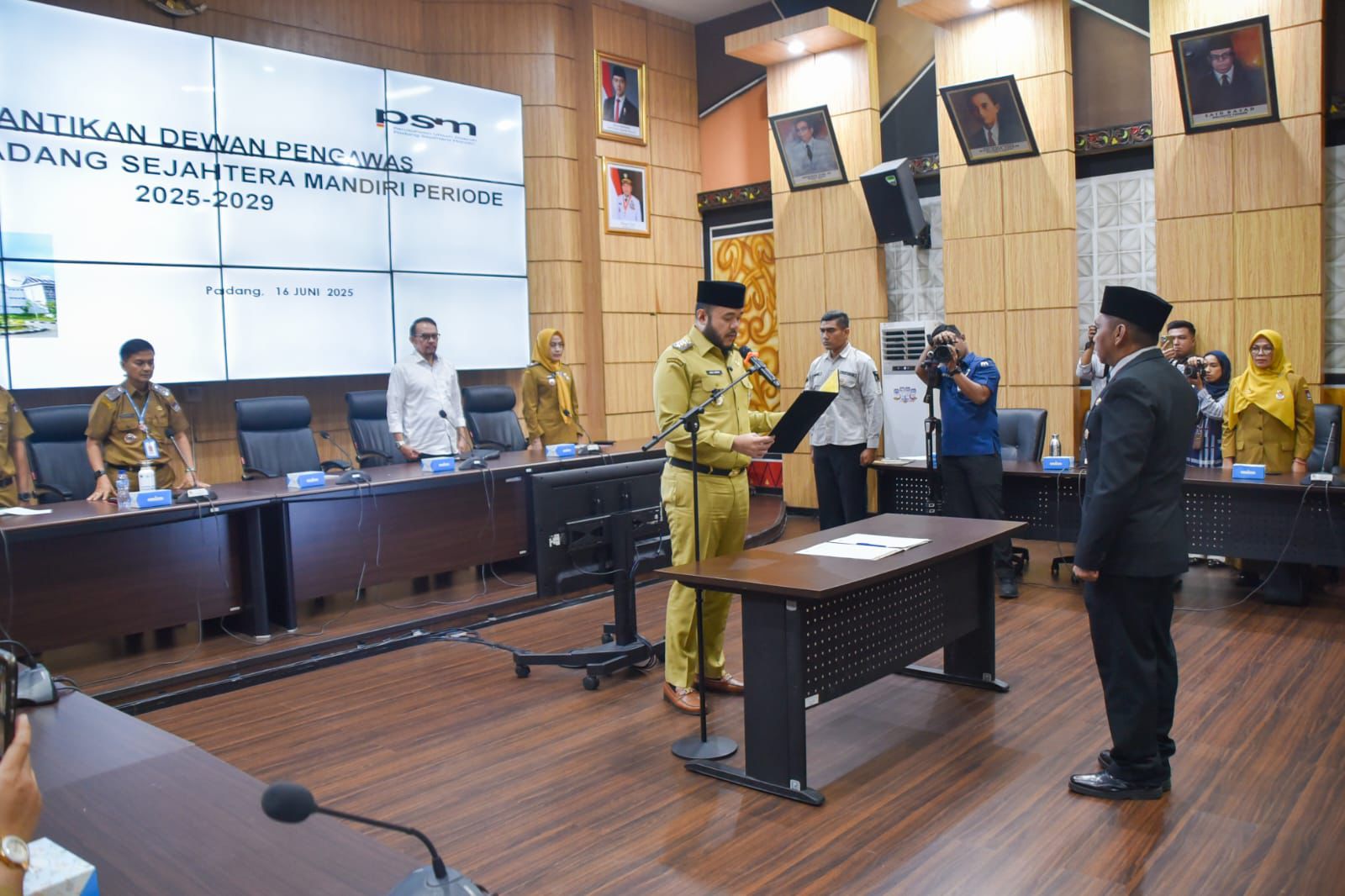 PADANG, KP — Wali Kota Padang Fadly Amran melantik Yudi Indra Sani sebagai Dewan Pengawas (Dewas) Perusahaan Umum Daerah (Perumda) Padang Sejahtera Mandiri (PSM) periode 2025–2029, Senin (16/6), di Aula Abu Bakar Jaar, Balai Kota Padang, Aie Pacah.