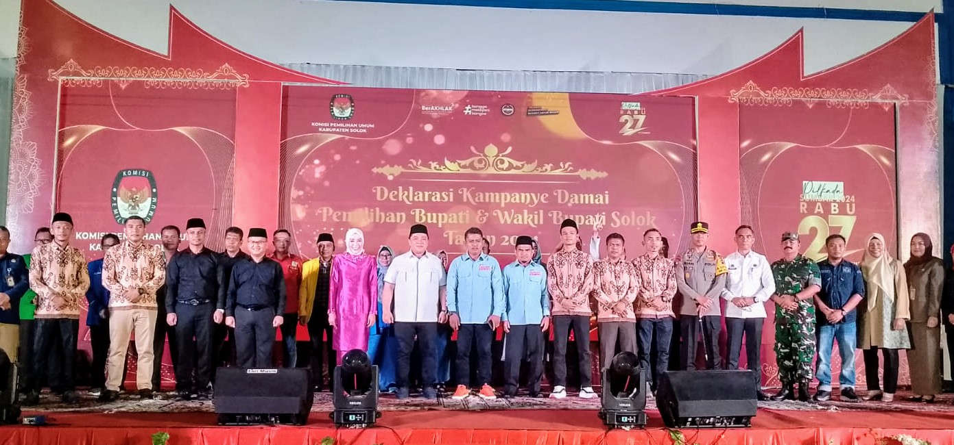 SOLOK, KP – Upaya mewujudkan Pemilihan Kepala Daerah (Pilkada) Kabupaten Solok yang bersih dan damai, Komisi Pemilihan Umum (KPU) Kabupaten Solok menggelar Deklarasi Kampanye Damai di GOR Batu Batupang, Selasa (24/9).