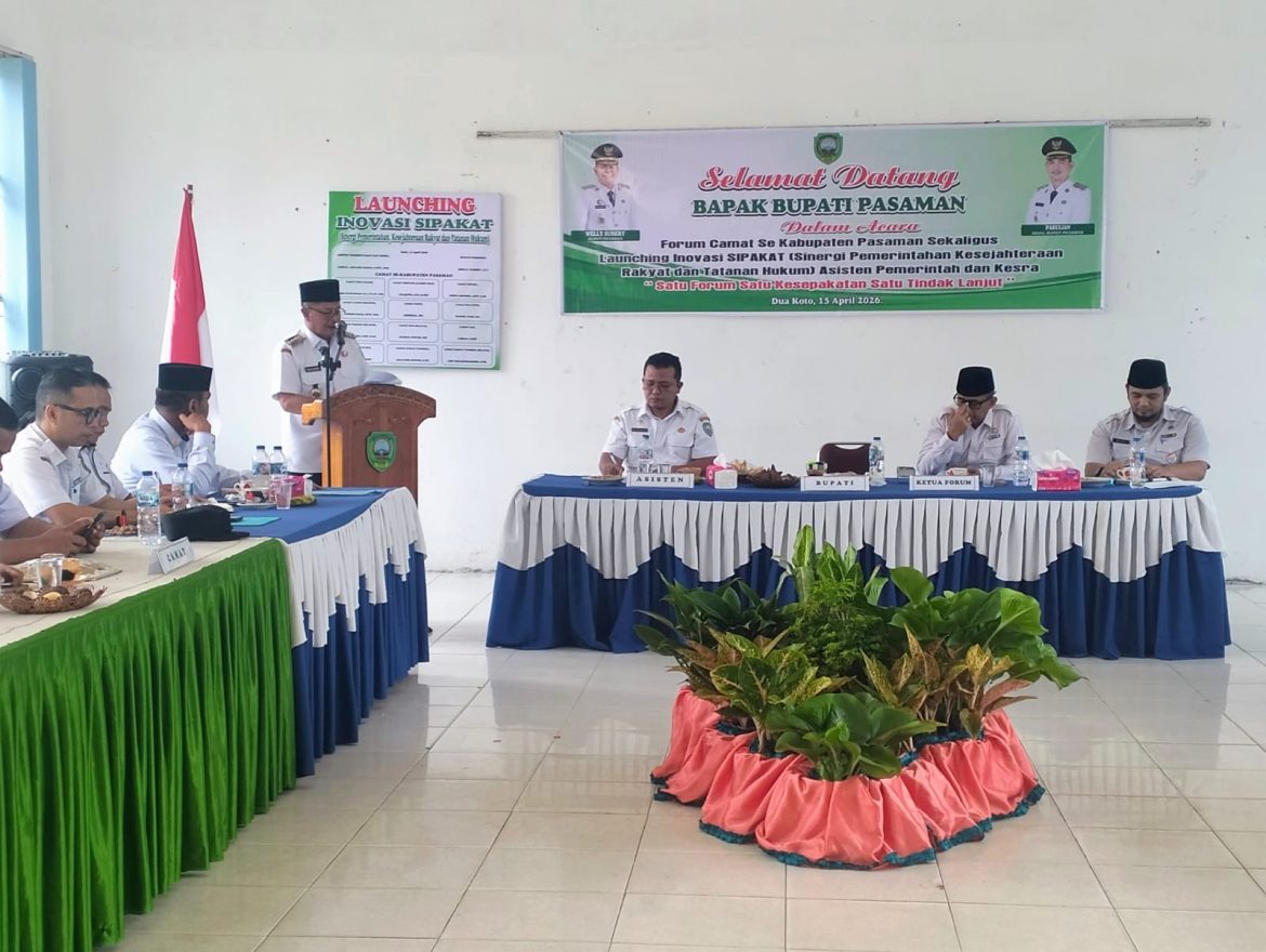 DUA KOTO, KP — Pemerintah Kabupaten Pasaman resmi meluncurkan inovasi ‘Sipakat’ (Sinergi Pemerintahan, Kesejahteraan Rakyat, dan Tatanan Hukum) dalam rangkaian Forum Camat se-Kabupaten Pasaman yang digelar di Aula Kantor Camat Dua Koto, Rabu (15/4). Hal ini bertujuan mendorong efektivitas penyelenggaraan pemerintahan melalui koordinasi lintas sektor yang lebih terpadu.