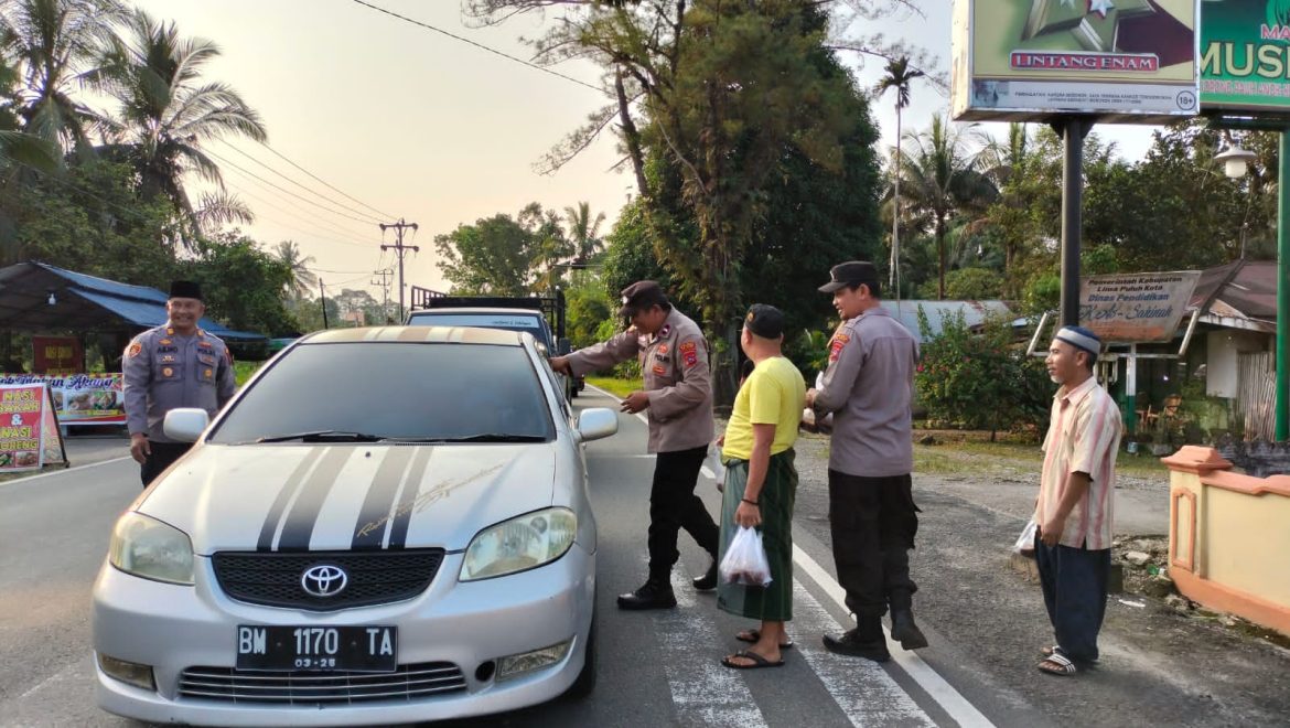 LIMAPULUH KOTA, KP – Polsek Pangkalan Polres 50 Kota berbagi takjil kepada masyarakat dan pengguna jalan yang melintasi di depan Mako Polsek Pangkalan, kemarin. Pembagian takjil dipimpin langsung Kapolsek Pangkalan AKP Akno Pilindo.