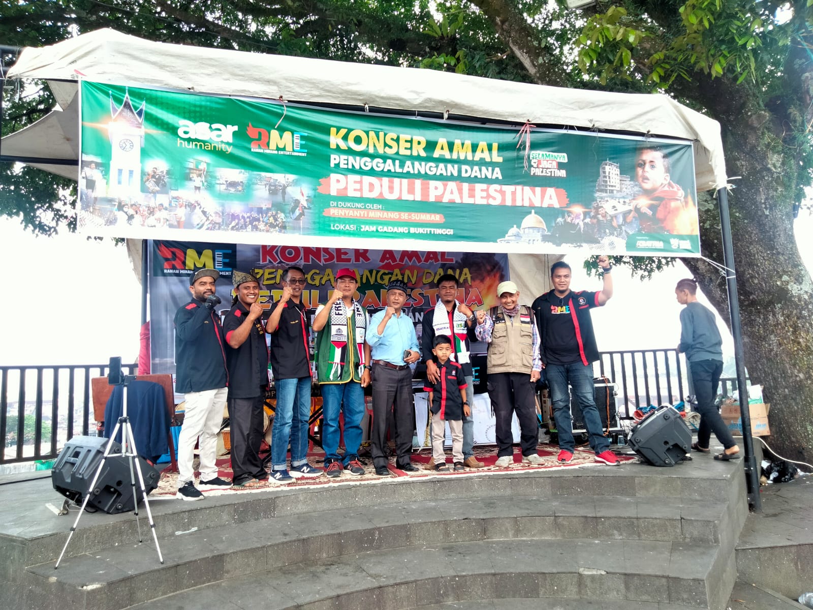 BUKITINGGI, KP – Perkumpulan insan seni Sumbar menggelar konser amal penggalangan dana bantuan kemanusian peduli Palestina, di pedestrian Ham Gadang, Minggu (12/11). Kegiatan itu diinisiasi anggota DPRD Bukitinggi dari Fraksi Demokrat, Erdison Nimli bekerjasama dengan Ranah Minang Entertainment (RME) dan Asra Humanity.