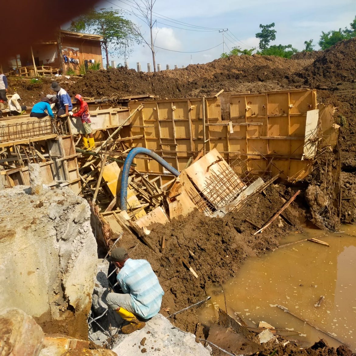 Genangan air juga tampak jelas di lokasi proyek. Hal ini menunjukkan tidak adanya pengendalian drainase atau sistem dewatering yang efektif untuk menjaga area proyek tetap kering. Genangan air tidak hanya memperlambat pengerjaan, tetapi juga menambah risiko terhadap stabilitas tanah dan keselamatan pekerja.