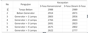 Tabel 1.2 Hasil Penelitian Perbandingan Kecepatan Motor Induksi 3-Fasa Konvensional dengan motor induksi 3-Fasa desain 6-Fasa tidak simetris 1 lapis 6 medan fluks