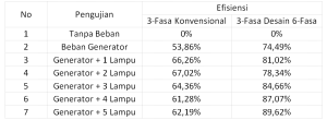 Tabel 1.3 Hasil Penelitian Perbandingan Efisiensi Motor Induksi 3-Fasa Konvensional dengan motor induksi 3-Fasa desain 6-Fasa tidak simetris 1 lapis 6 medan fluks