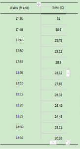 Nilai suhu = 31 + 29,75 + 28,5 + 28,12 + 26,31 + 24,45 + 20,35 = 26,890C