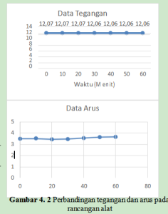 Pada gambar 4.4 di atas menunjukkan perbandingan tegangan dan arus pada alat, dimana dapat dilihat pada grafik tegangan dan arus pada alat selama satu jam. Secara teori perbandingan nilai tegangan dengan arus yaitu sebanding atau berbanding lurus sesuai dengan hukum ohm yaitu seperti persamaan di bawah: