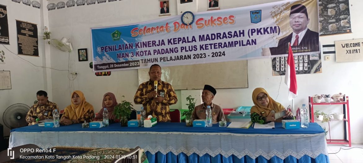 PADANG, KP – Kepala MAN 3 Padang Afrizal mengikuti Penilaian Kinerja Kepala Madrasah (PPKM) yang dilaksanakan di madrasah setempat, Rabu (10/1). PPKM merupakan agenda tahunan yang diselenggarakan Kementerian Agama sebagai salah satu upaya untuk evaluasi kinerja kepala madrasah.