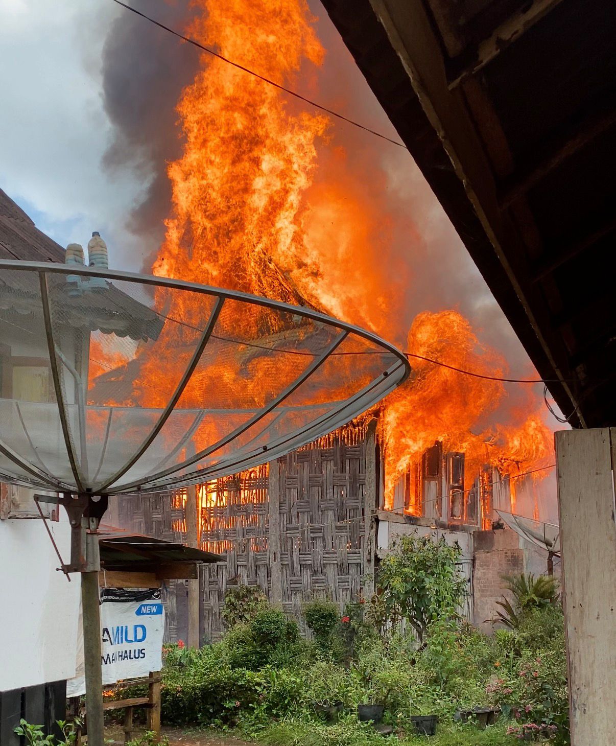 Kobaran api yang membumbung tinggi disertai asap hitam pekat membuat warga sekitar panik dan berupaya menyelamatkan barang-barang dari rumah yang berada di sekitar lokasi kejadian.