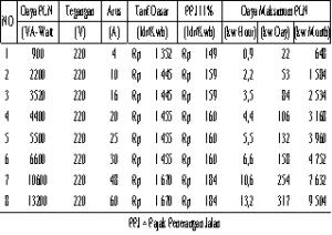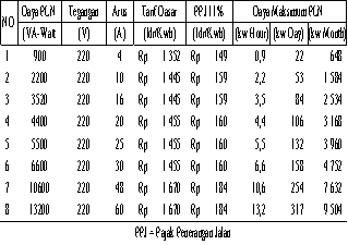 Pada tabel ini terlihat daya PLN sebesar 900 dengan tegangan sebesar 220 Volt dan dibagi dengan arus, sehingga menghasilkan arus sebesar 4 A. Untuk tabel dibawah cara mencarinya sama dengan yang diatas.