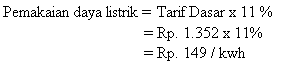 Selanjutnya pada tarif dasar PLN yang di dapat melalui puil PLN sebesar Rp. 1.352, lalu dikalikan dengan pajak 11% sehingga mendapatkan hasil sebesar Rp. 149/ kwh. Untuk tabel dibawah cara mencarinya sama dengan yang diatas.
