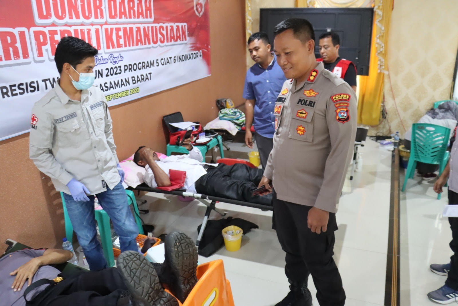 PASAMAN BARAT, KP – Polres Pasaman Barat menggandeng Palang Merah Indonesia (PMI) Kabupaten Pasaman Barat dalam upaya menjaga ketersediaan darah melalui aksi donor darah bertajuk ‘Polres Pasaman Barat Peduli Kemanusiaan’. Kegiatan itu dilaksanakan di aula Bhayangkara Mapolres Pasaman Barat, Rabu (27/9). Donor darah itu diikuti personel polres, personel TNI, dan berbagai lapisan masyarakat.