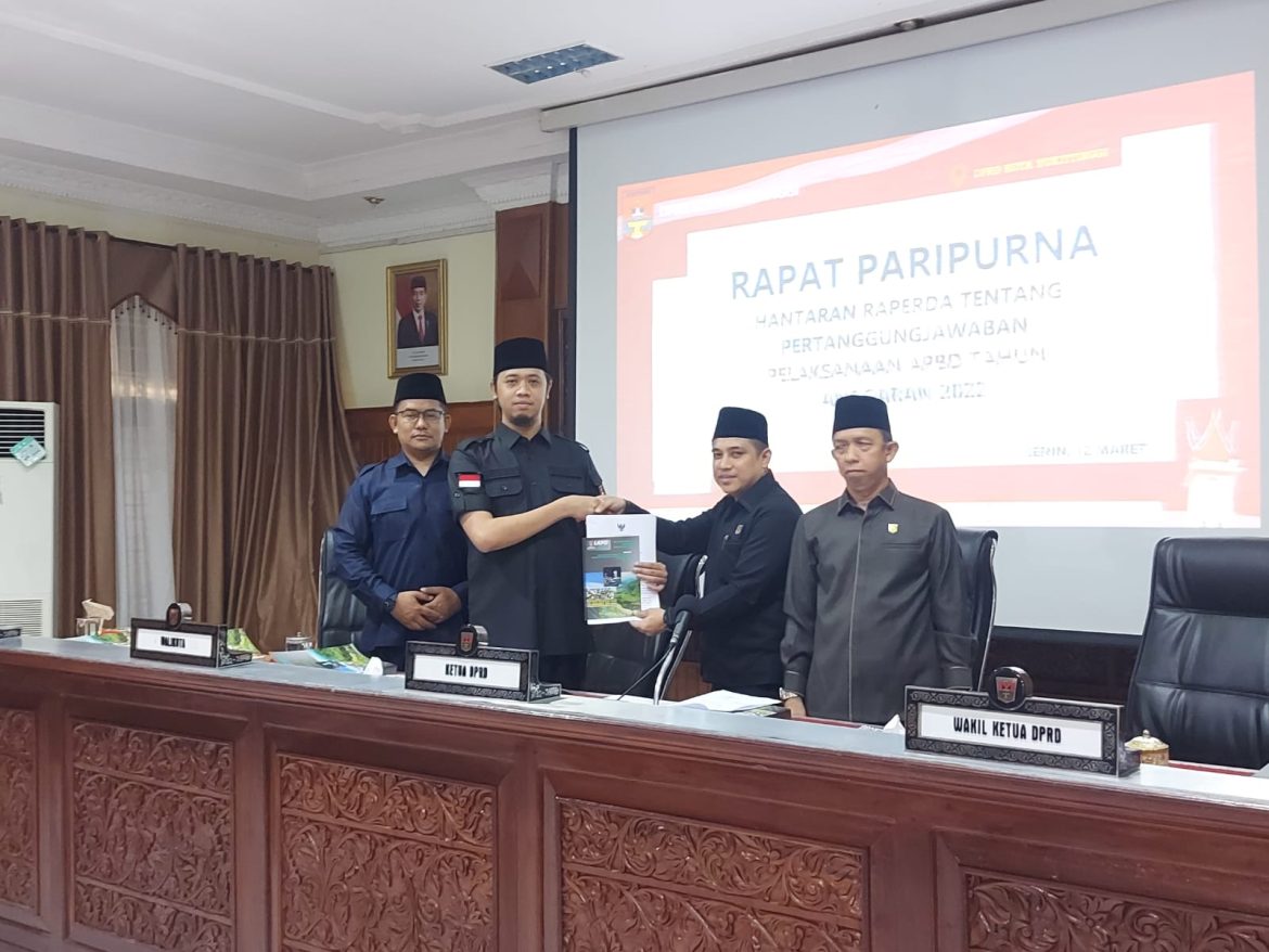 BUKITTINGGI, KP – Walikota Bukittinggi menyampaikan nota pengantar Rancangan Peraturan Daerah (ranperda) Pertanggungjawaban Pelaksanaan APBD 2022, dalam rapat paripurna DPRD, di gedung DPRD, Senin (12/6).